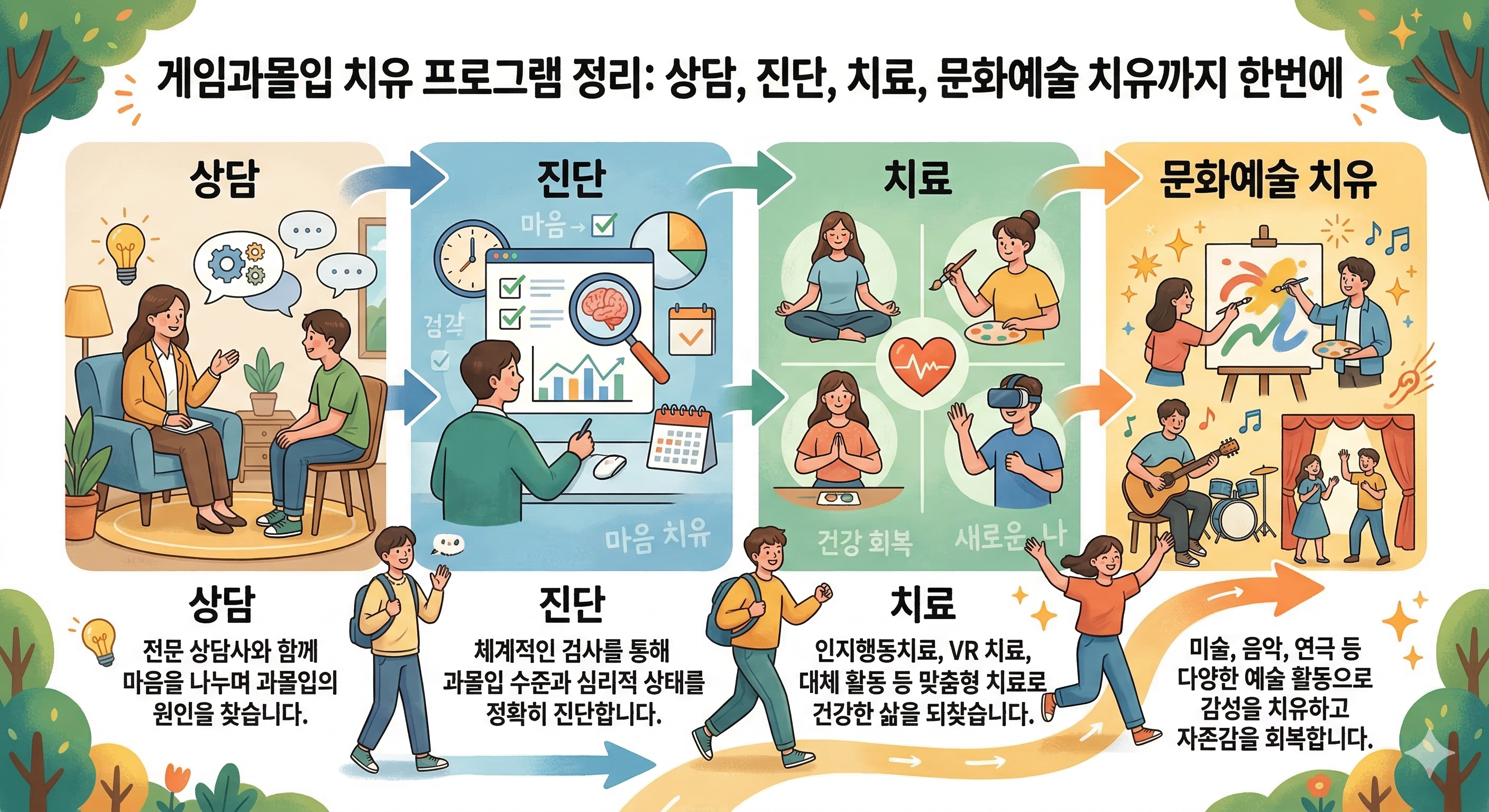 - 문화예술·체육 치유: 음악·미술·체육 활동을 활용해 게임 대신 몰입할 수 있는 건강한 경험을 제공하고, 성취감과 자기 효능감을 회복하도록 돕습니다.